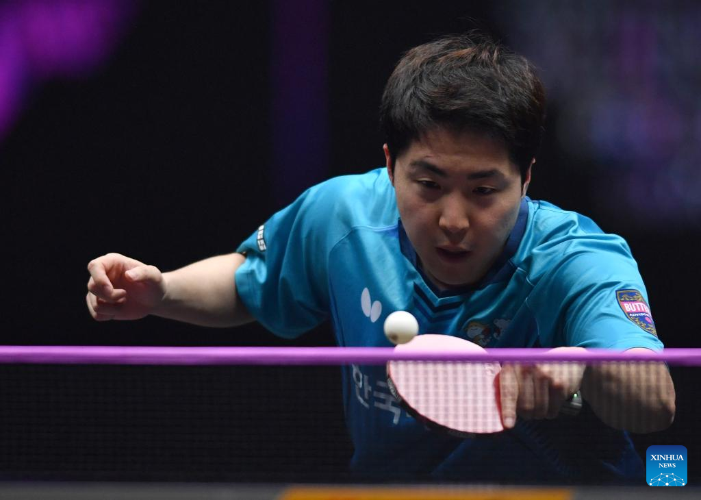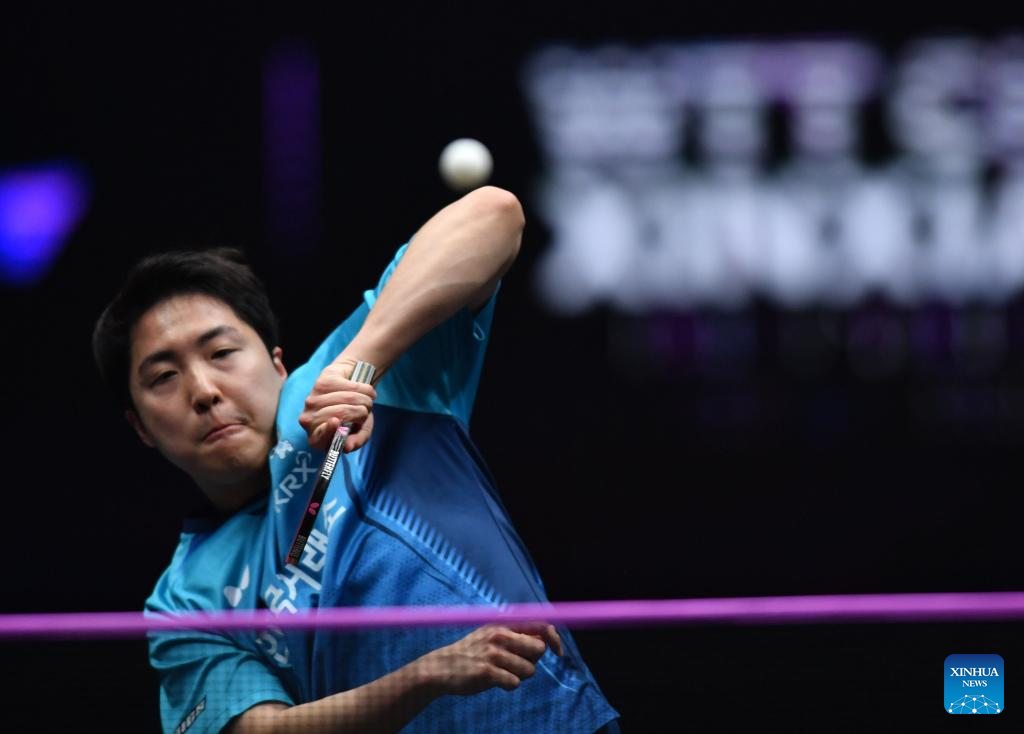 Lim Jonghoon of South Korea hits a return during the men's singles semifinal match between Fan Zhendong of China and Lim Jonghoon of South Korea at the WTT Champions Xinxiang 2023 in Xinxiang, central China's Henan Province, April 14, 2023. (Xinhua/Li Jianan)