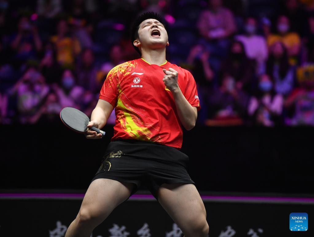 Fan Zhendong of China celebrates after winning the men's singles semifinal match between Fan Zhendong of China and Lim Jonghoon of South Korea at the WTT Champions Xinxiang 2023 in Xinxiang, central China's Henan Province, April 14, 2023. (Xinhua/Li Jianan)