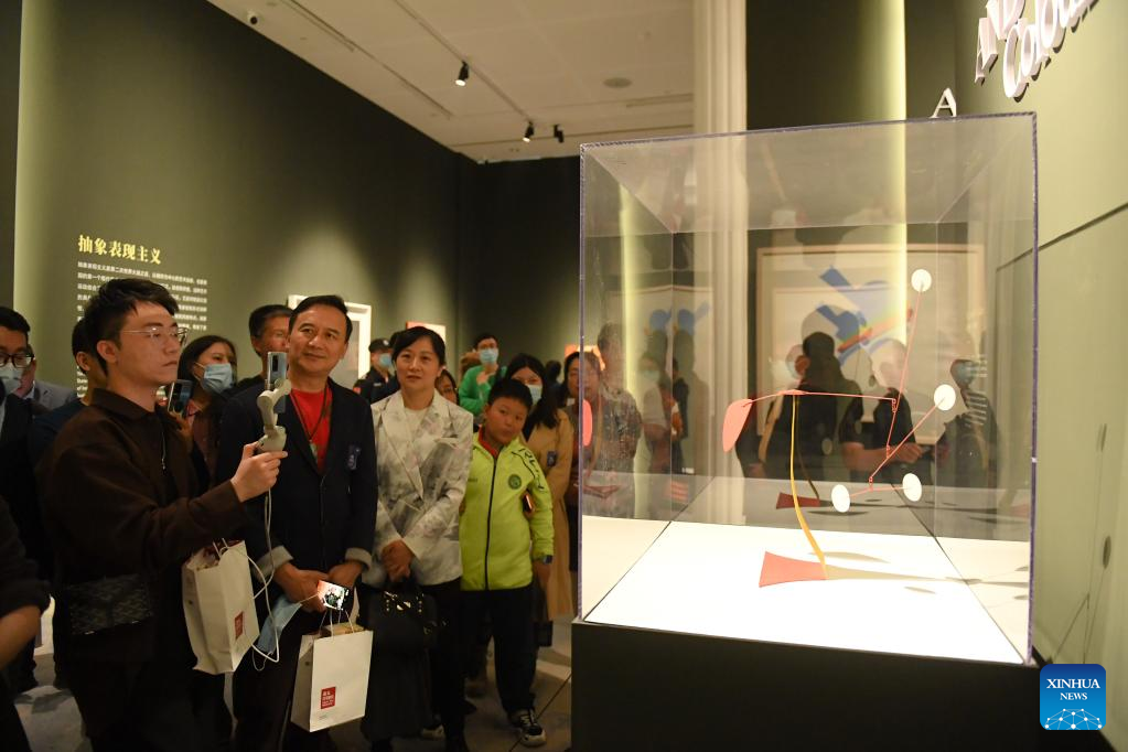 Visitors look at "Four White Discs and Red Rubber" by Alexander Calder at the Hangzhou Pavilion of the Meet You Museum in Hangzhou, East China's Zhejiang Province, April 14, 2023. The Hangzhou Pavilion of the Meet You Museum officially opened on Friday. Two exhibitions featuring artworks of well-known Western artists including Vincent van Gogh and Claude Monet were launched for the public on the opening day. (Xinhua/Weng Xinyang)