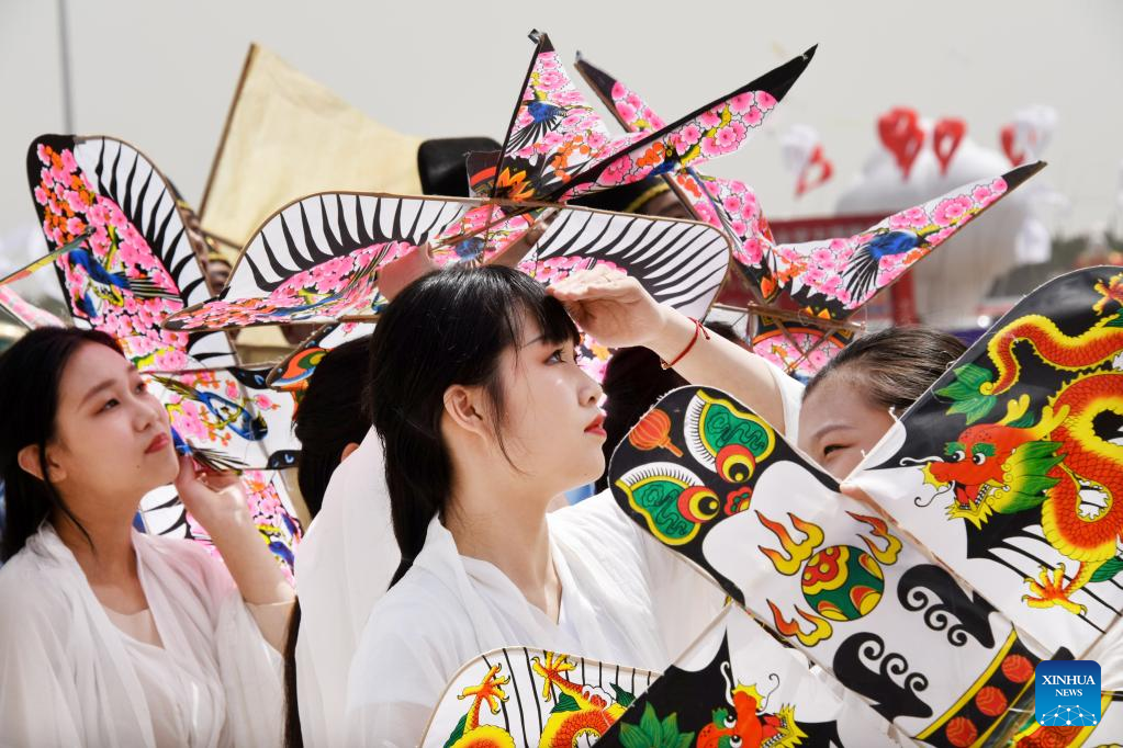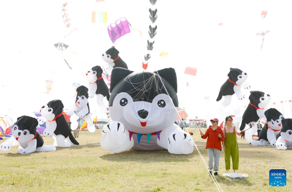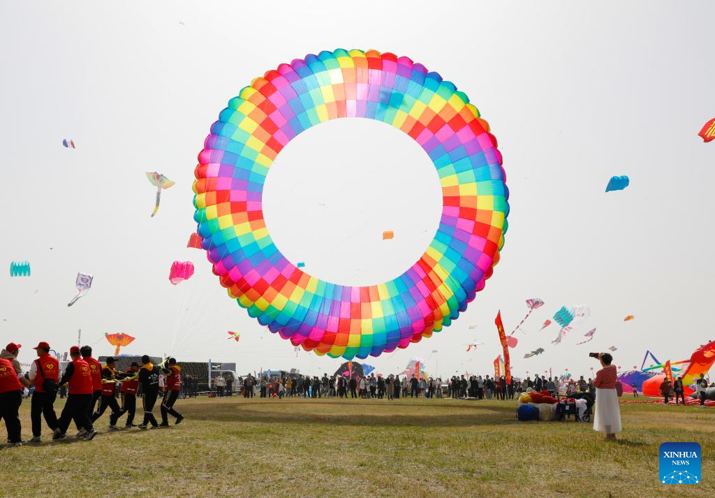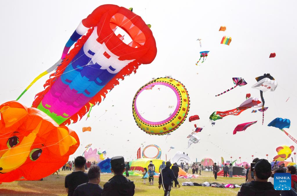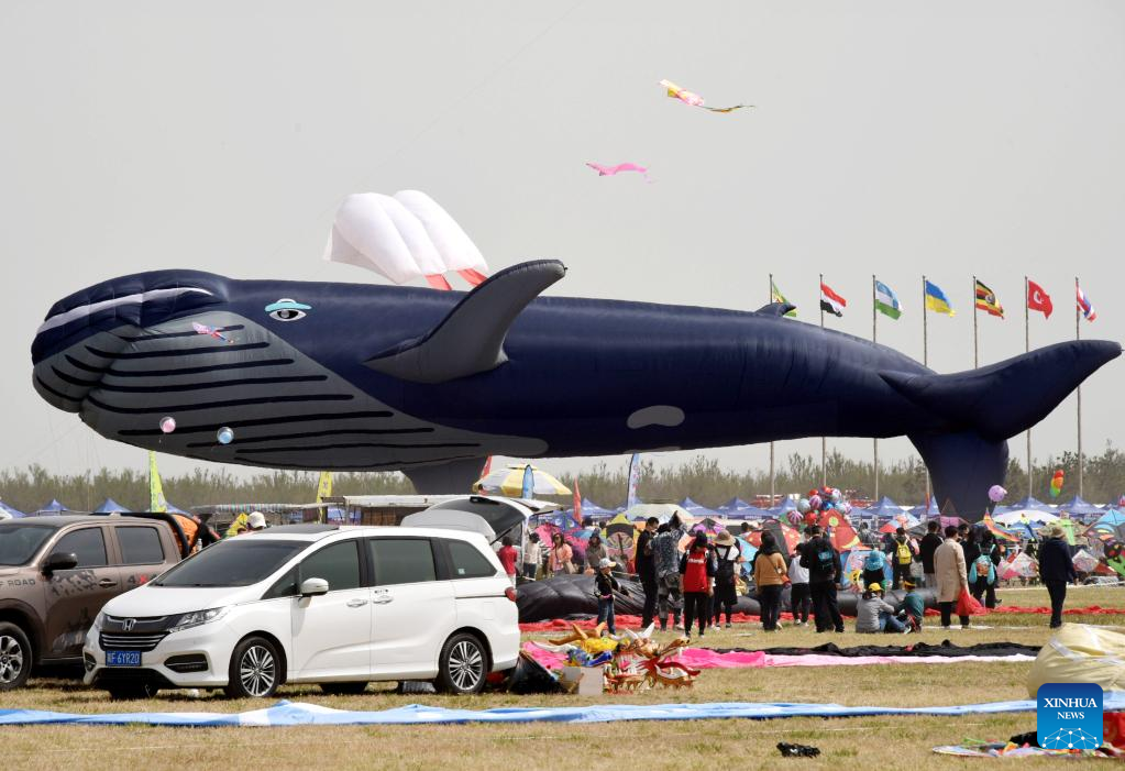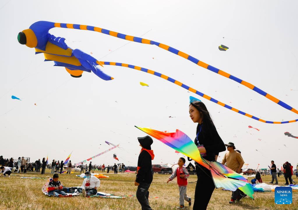 People attend the 40th Weifang International Kite Festival in Weifang, east China's Shandong Province, April 15, 2023. The kite flying competition of the 40th Weifang International Kite Festival kicked off here Saturday. (Xinhua/Li Ziheng)