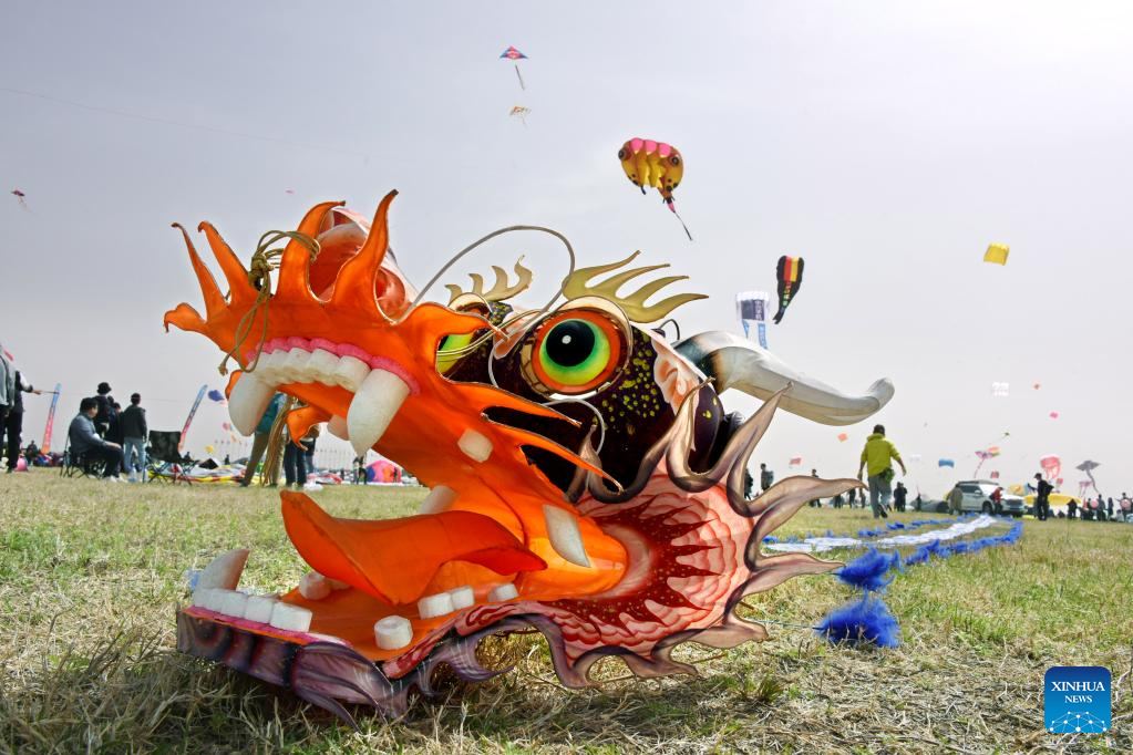 A dragon-shaped kite is pictured during the 40th Weifang International Kite Festival in Weifang, east China's Shandong Province, April 15, 2023. The kite flying competition of the 40th Weifang International Kite Festival kicked off here Saturday. (Xinhua/Li Ziheng)