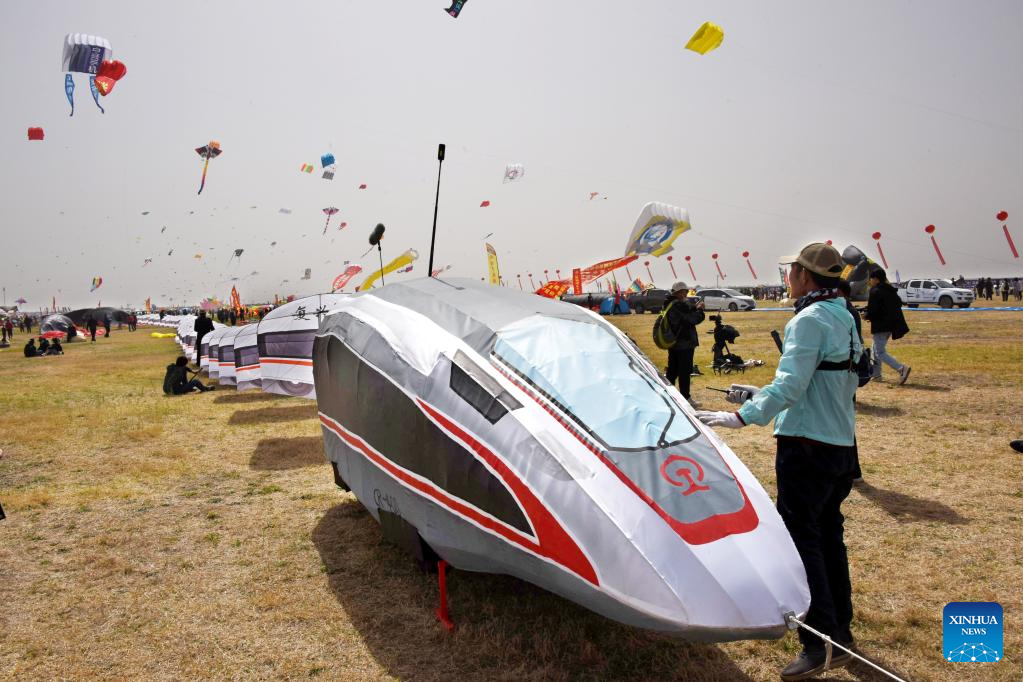 People try to fly a train-shaped kite during the 40th Weifang International Kite Festival in Weifang, east China's Shandong Province, April 15, 2023. The kite flying competition of the 40th Weifang International Kite Festival kicked off here Saturday. (Xinhua/Li Ziheng)