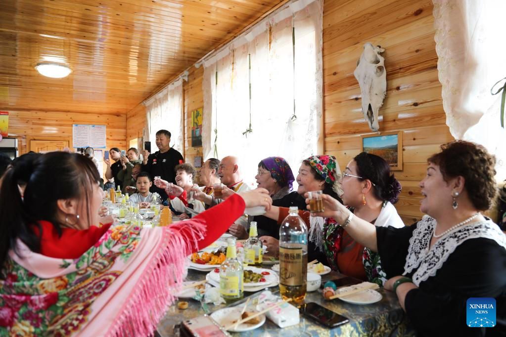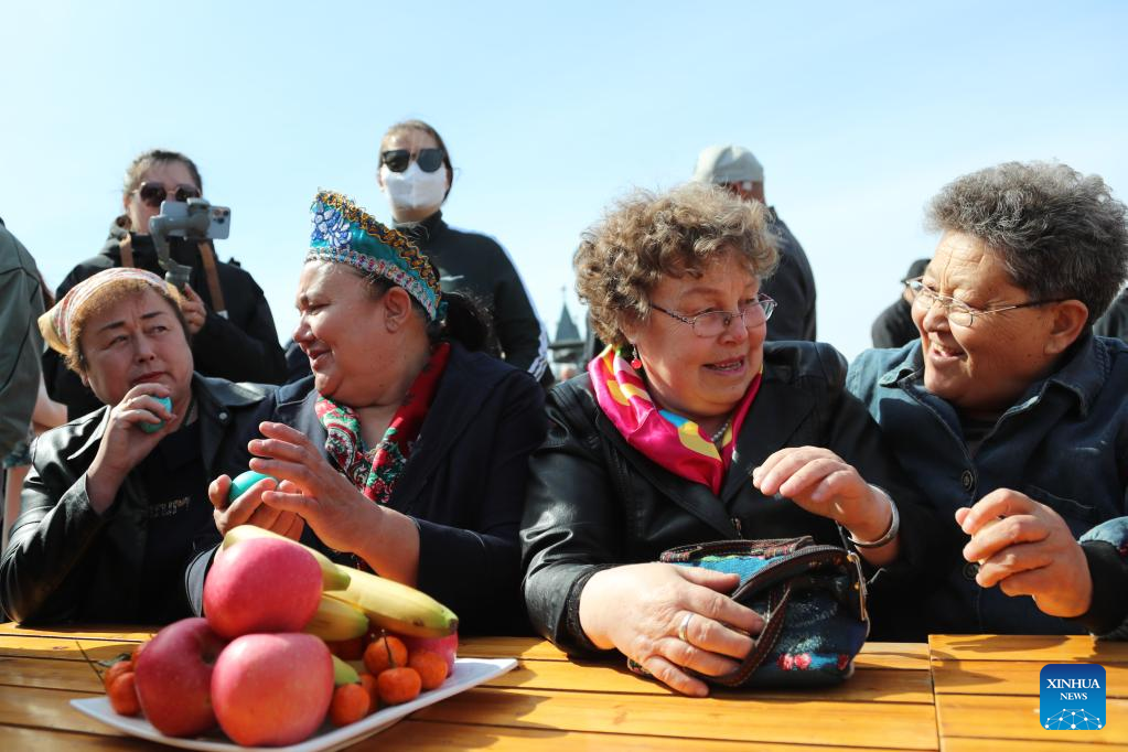 People of Russian ethnic group gather to celebrate the Russian Easter festival in Enhe Township of Hulun Buir, north China's Inner Mongolia Autonomous Region, April 16, 2023. The Russian Easter festival celebrated by people of Russian ethnic group has been listed as China's national intangible cultural heritage. Various feasts and activities are held during the week-long celebration. (Xinhua/Wang Kaiyan)