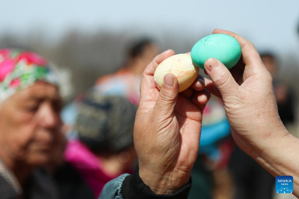 People of Russian ethnic group play an egg tapping game to celebrate the Russian Easter festival in Enhe Township of Hulun Buir, north China's Inner Mongolia Autonomous Region, April 16, 2023. The Russian Easter festival celebrated by people of Russian ethnic group has been listed as China's national intangible cultural heritage. Various feasts and activities are held during the week-long celebration. (Xinhua/Wang Kaiyan)