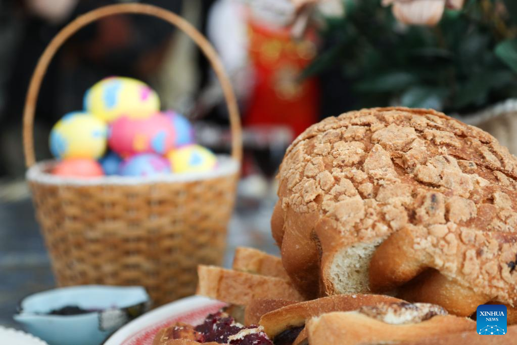 This photo taken on April 16, 2023 shows food and colorful dyed eggs prepared by people of Russian ethnic group in celebration of the Russian Easter festival in Enhe Township of Hulun Buir, north China's Inner Mongolia Autonomous Region. The Russian Easter festival celebrated by people of Russian ethnic group has been listed as China's national intangible cultural heritage. Various feasts and activities are held during the week-long celebration. (Xinhua/Wang Kaiyan)