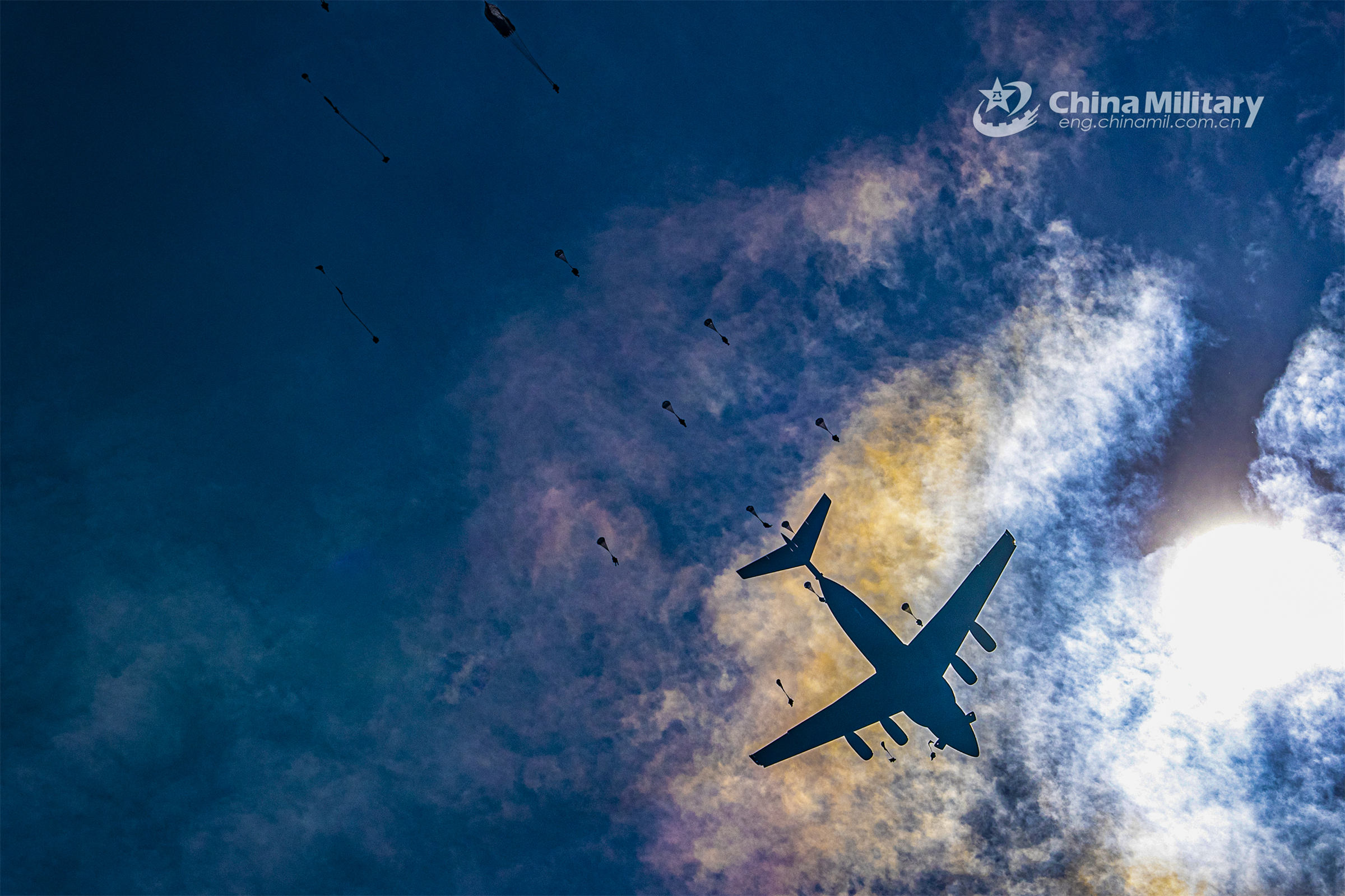 Paratroopers assigned to an airborne brigade with the air force jump out of a transport aircraft during a military jump in early April, 2023. (eng.chinamil.com.cn/Photo by Yang Jielin)