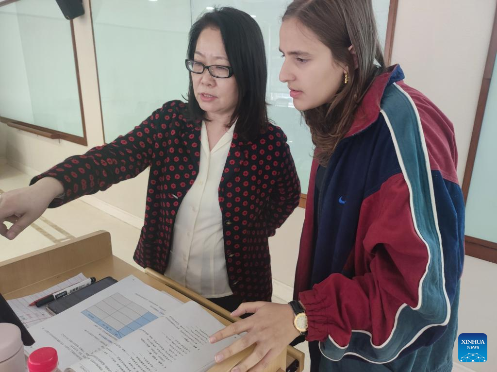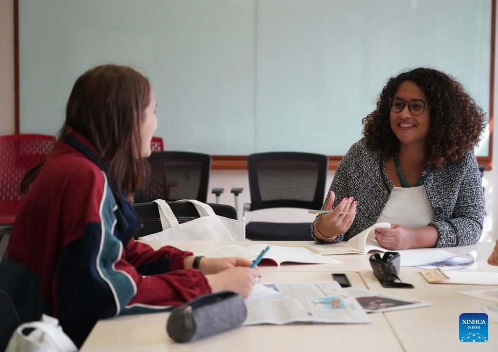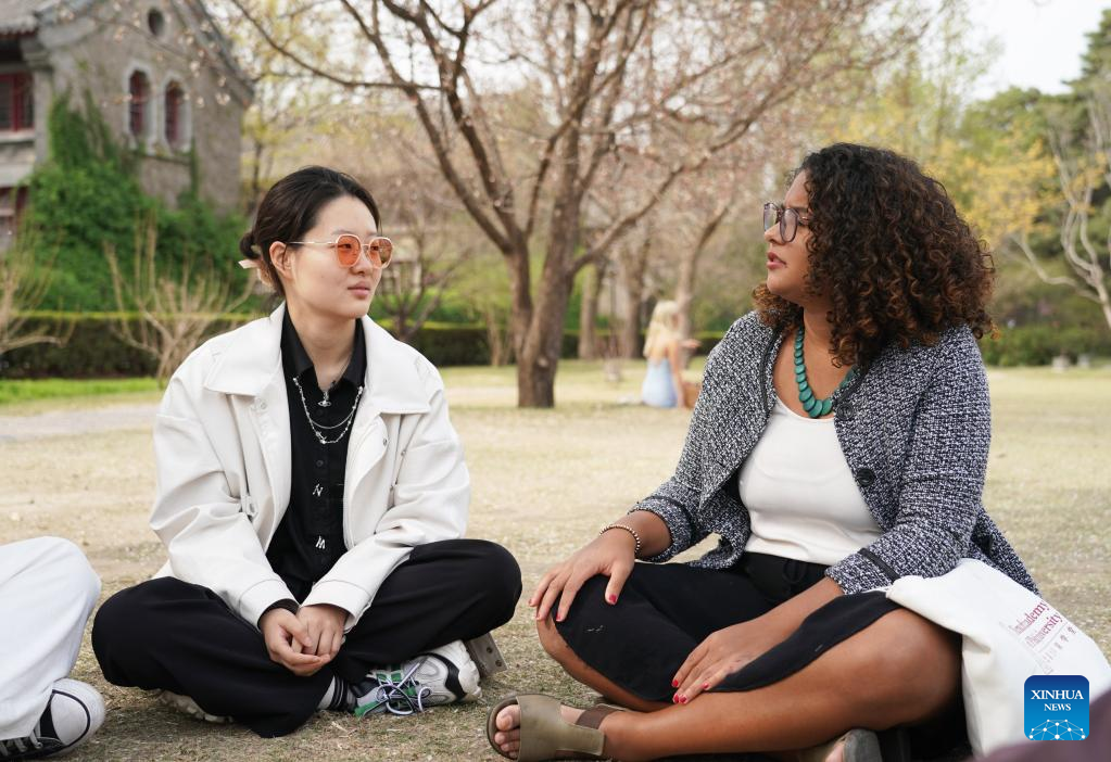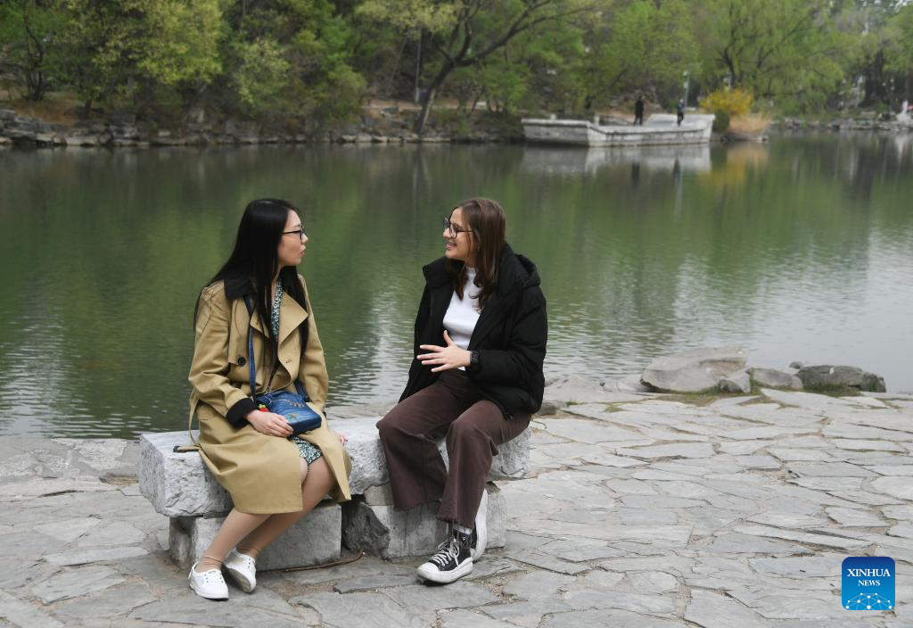 Maria (R) chats with her language partner Yin Yue, a student majoring in Teaching Chinese as a Second Language, at Peking University in Beijing, capital of China, April 13, 2023. (Xinhua/Liu Lingyi)