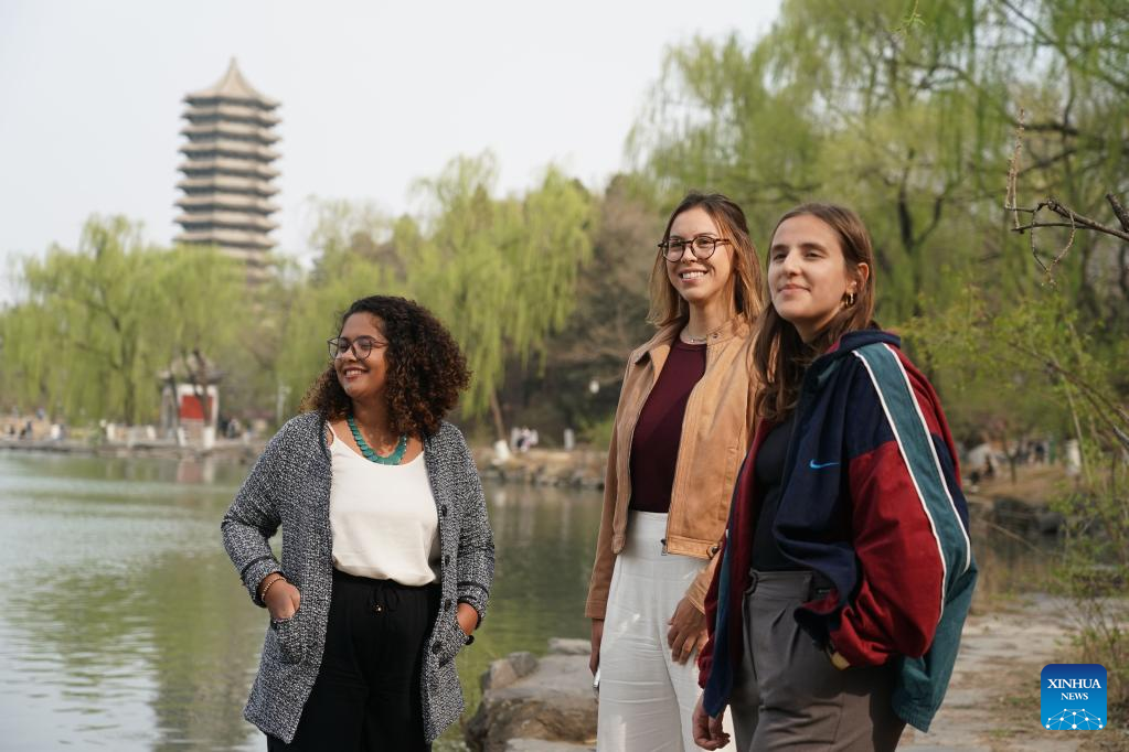 Rafaela (L), Manuela (C) and Maria pose for a photo near the Weiming Lake of Peking University in Beijing, capital of China, March 31, 2023. (Xinhua/Ren Chao)