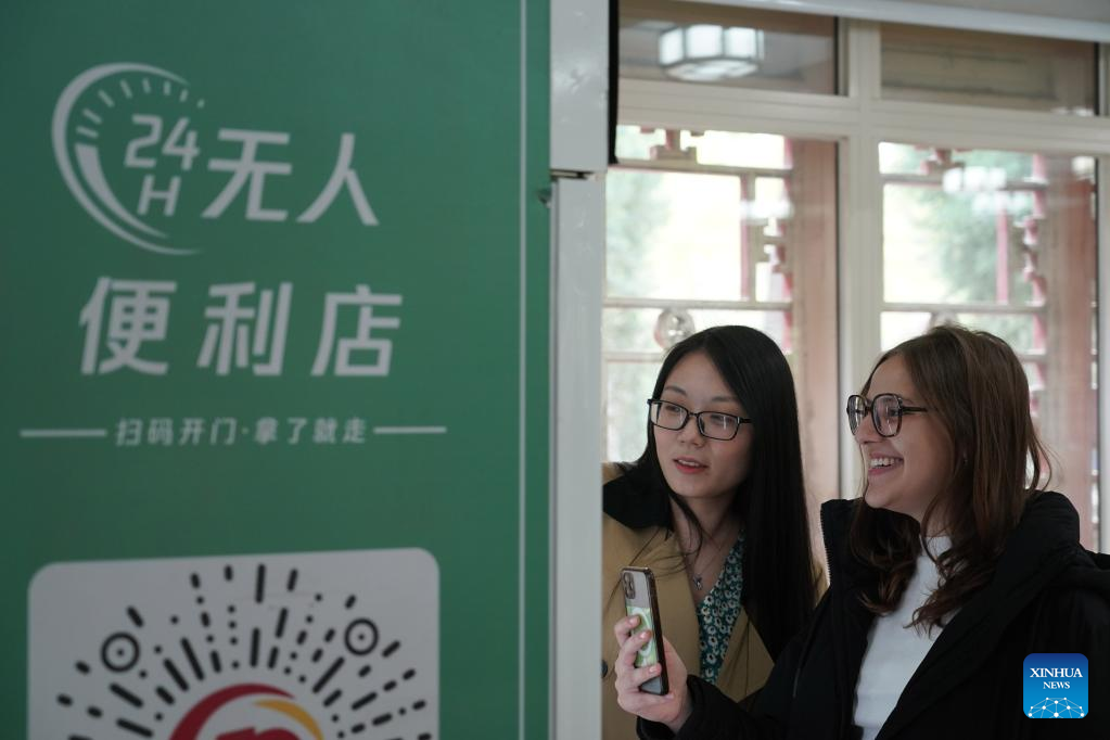 Maria (R) scans a QR code on a vending machine at the Yenching Academy of Peking University in Beijing, capital of China, April 13, 2023. (Xinhua/Ren Chao)