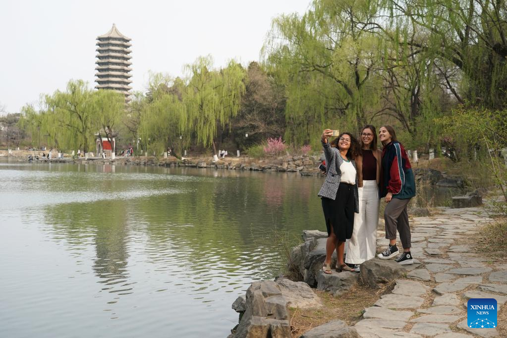 Rafaela (L), Manuela (C) and Maria take a selfie near the Weiming Lake of Peking University in Beijing, capital of China, March 31, 2023. (Xinhua/Ren Chao)