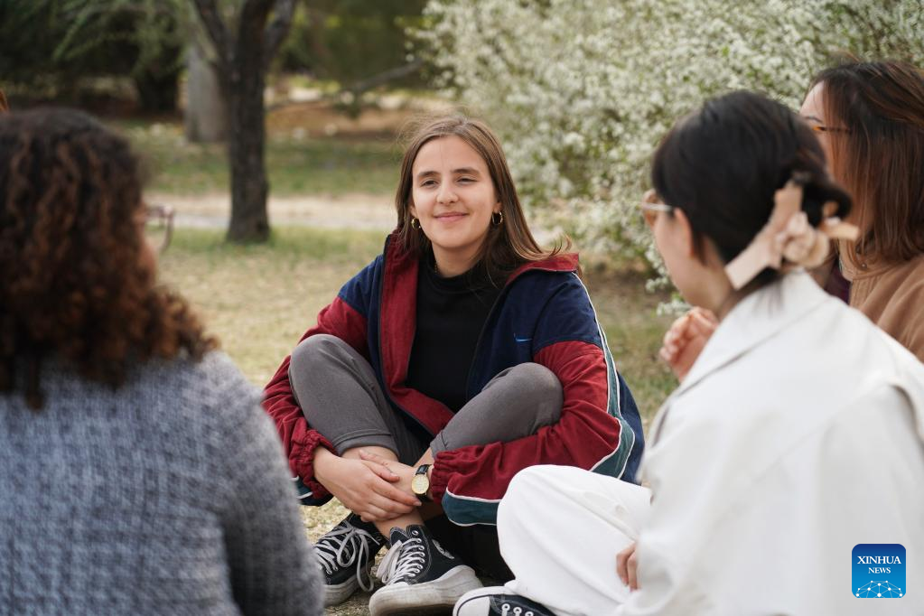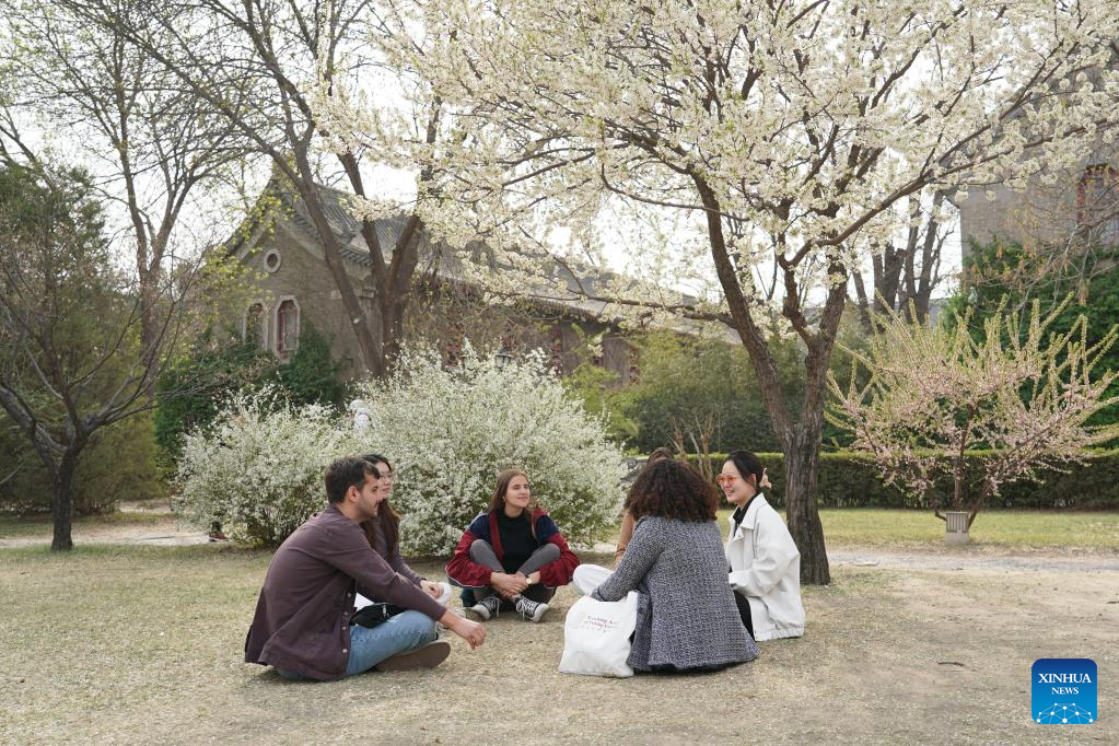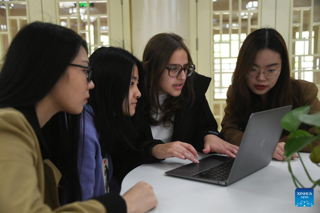Maria (2nd R) talks with schoolmates at the Yenching Academy of Peking University in Beijing, capital of China, April 13, 2023. (Xinhua/Liu Lingyi)