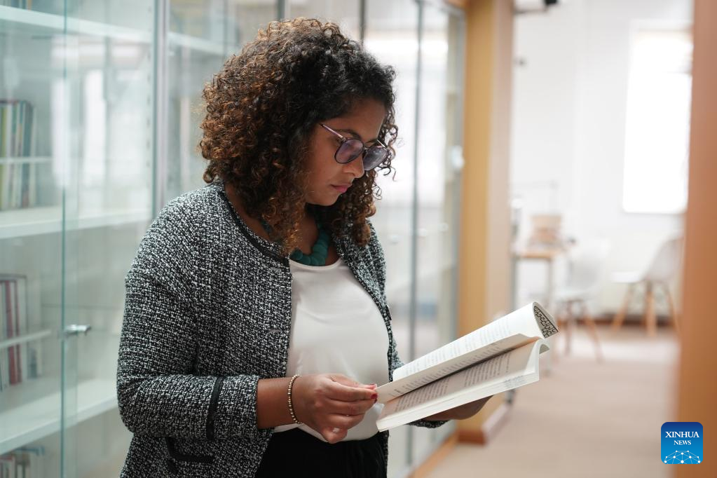 Rafaela (R) reads a book at a library of Peking University in Beijing, capital of China, March 31, 2023. (Xinhua/Ren Chao)