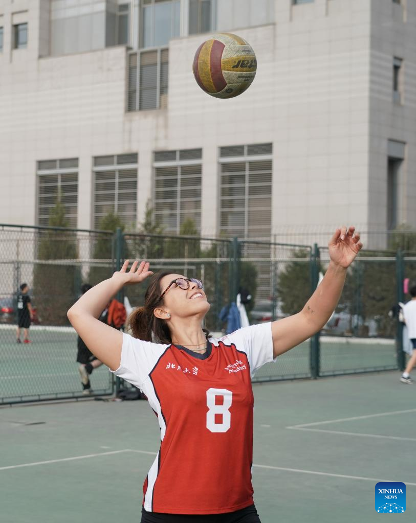 Manuela practices volleyball at Peking University in Beijing, capital of China, March 31, 2023. (Xinhua/Ren Chao)