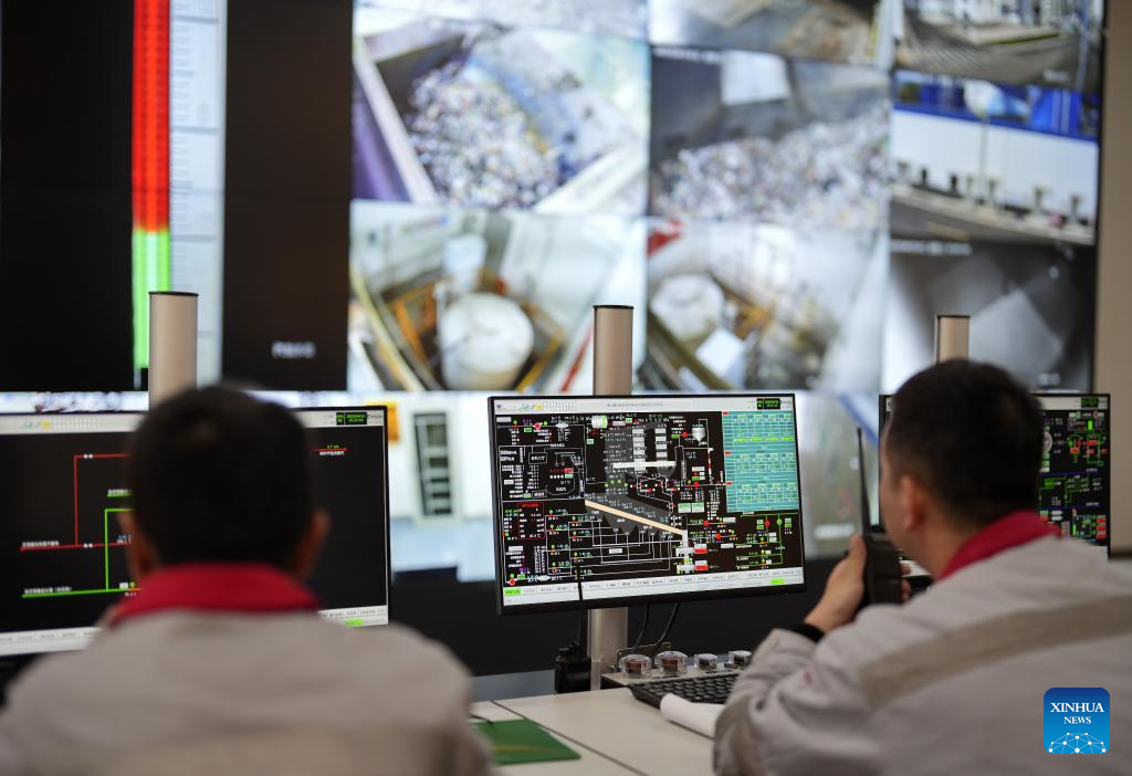 Staff members monitor equipment operation at Tangshan Jidong Qixin Cement Co., Ltd. in Tangshan, north China's Hebei Province, April 13, 2023. The history of Tangshan Jidong Qixin Cement Co., Ltd., formerly known as Tangshan Qixin Cement Plant, dates back to 1889. In recent years, the company has switched to a high-quality green development mode, achieving both economic and ecological benefits. (Xinhua/Mu Yu)