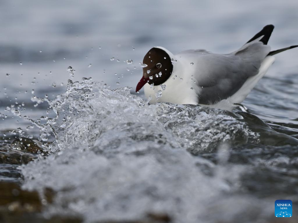 This photo taken on April 13, 2023 shows a brown-headed gull foraging in the Qinghai Lake in northwest China's Qinghai Province. (Xinhua/Zhang Long)
