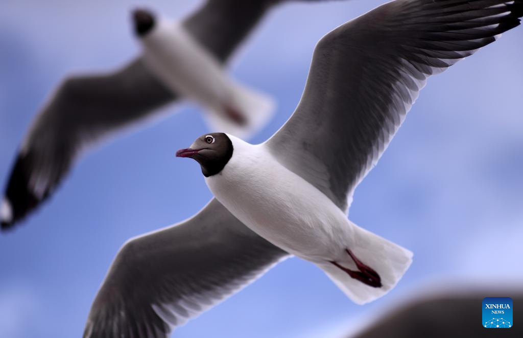 This photo taken on April 13, 2023 shows a brown-headed gull flying above the Qinghai Lake in northwest China's Qinghai Province. (Xinhua/Zhang Hongxiang)