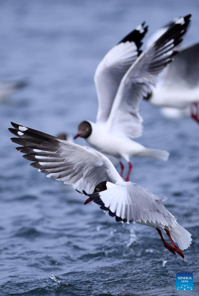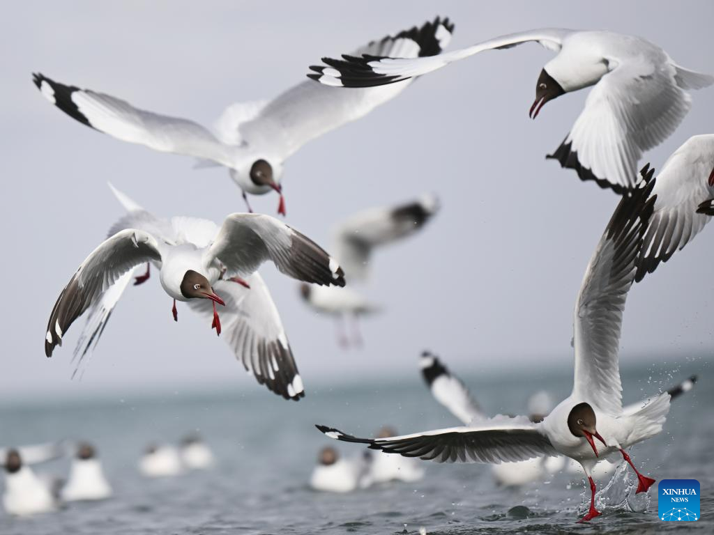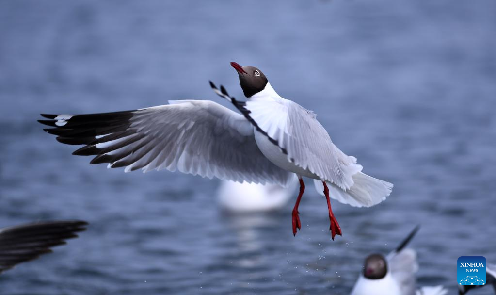 This photo taken on April 14, 2023 shows brown-headed gulls flying above the Qinghai Lake in northwest China's Qinghai Province. (Xinhua/Zhang Hongxiang)