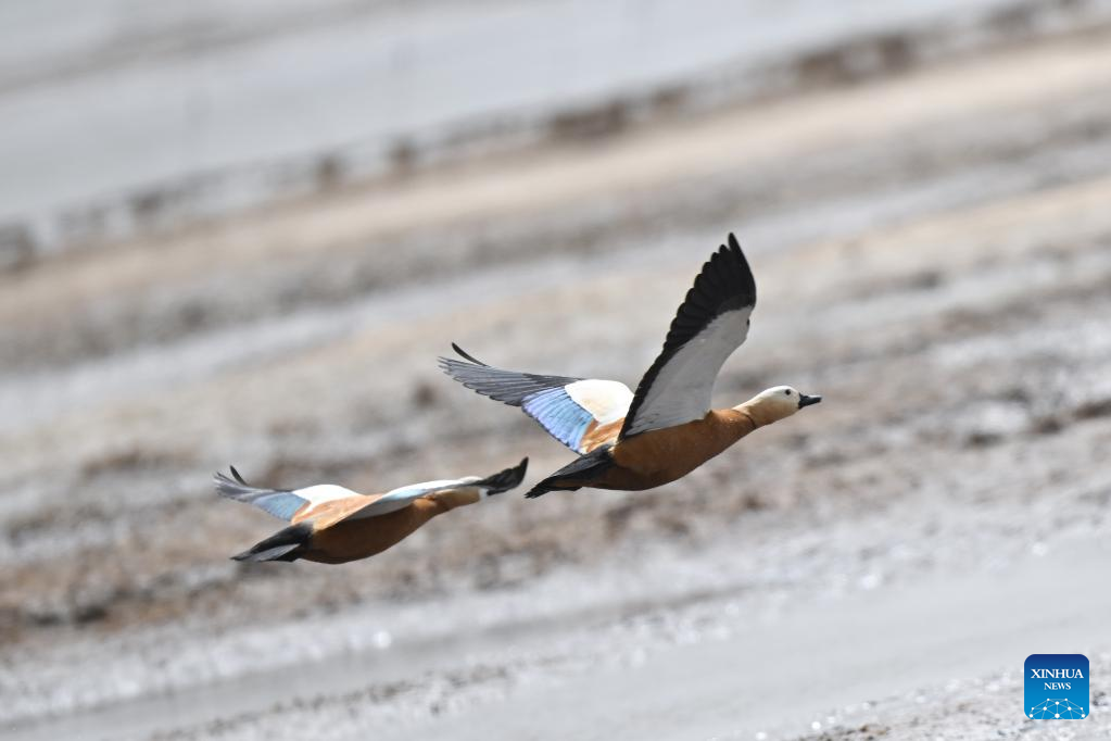 This photo taken on April 14, 2023 shows ruddy shelduck flying above the Qinghai Lake in northwest China's Qinghai Province. (Xinhua/Zhang Long)