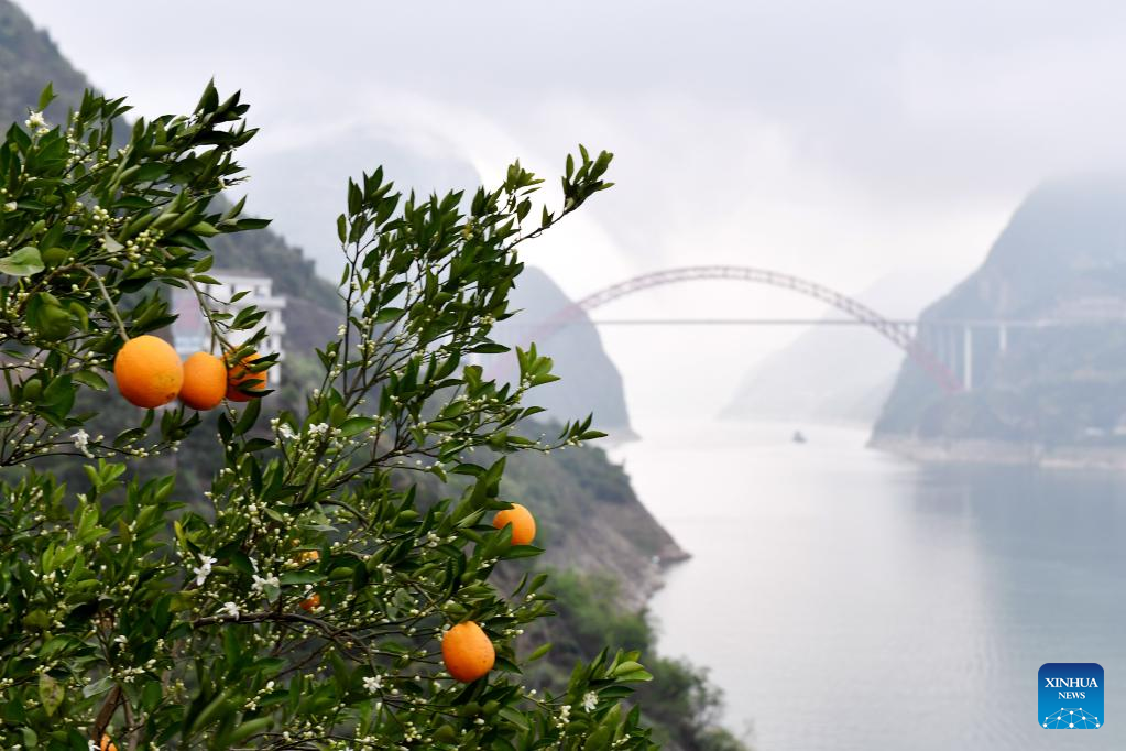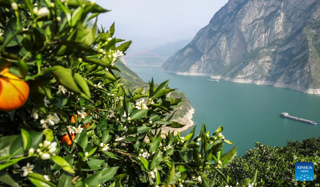 Ships sail past a navel orange garden at Lianziyan Village, Quyuan Township in Zigui County, central China's Hubei Province, April 15, 2023. Zigui County is known for navel orange production. Late-maturing navel oranges have entered the harvest season in the county. (Xinhua/Wang Gang)