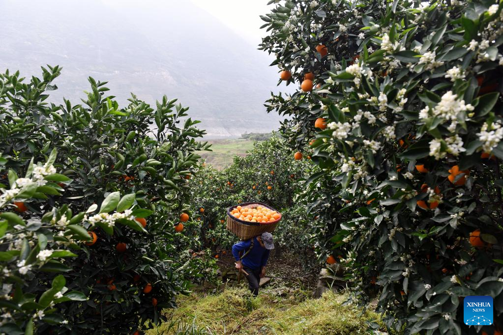 Villagers transport late-maturing navel oranges at Xiangxi Village, Guizhou Township in Zigui County, central China's Hubei Province, April 15, 2023. Zigui County is known for navel orange production. Late-maturing navel oranges have entered the harvest season in the county. (Xinhua/Wang Huifu)
