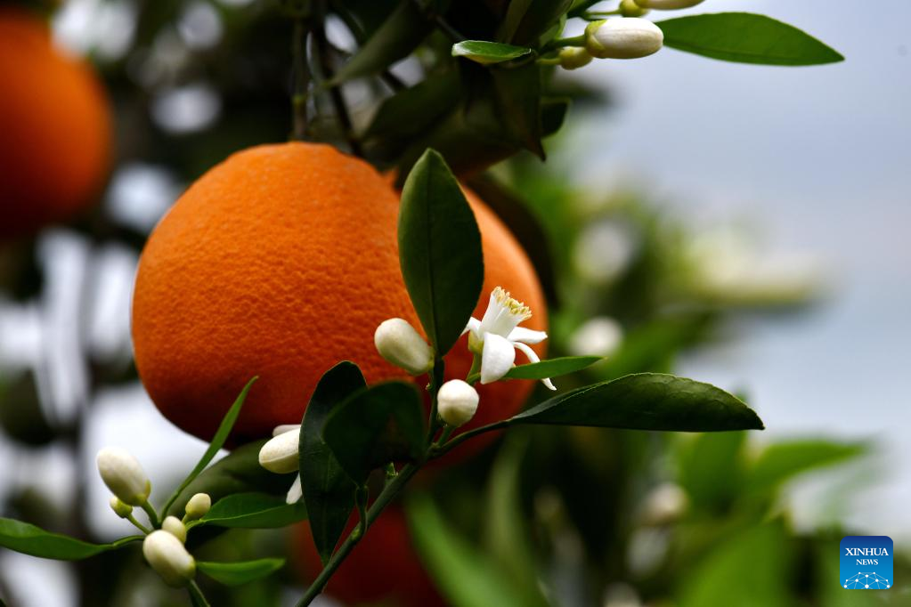 This photo taken on April 15, 2023 shows late-maturing navel oranges on the trees at Xiangxi Village, Guizhou Township in Zigui County, central China's Hubei Province. Zigui County is known for navel orange production. Late-maturing navel oranges have entered the harvest season in the county. (Xinhua/Wang Huifu)