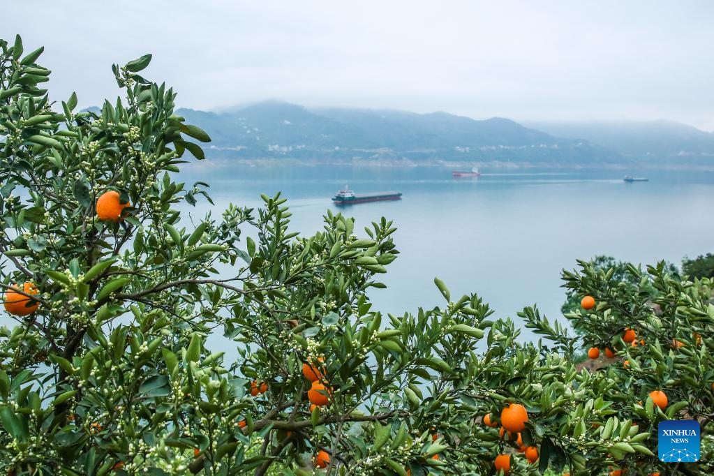 Ships sail past a navel orange garden at Zhoujiawan Village, Guizhou Township in Zigui County, central China's Hubei Province, April 15, 2023. Zigui County is known for navel orange production. Late-maturing navel oranges have entered the harvest season in the county. (Xinhua/Wang Gang)