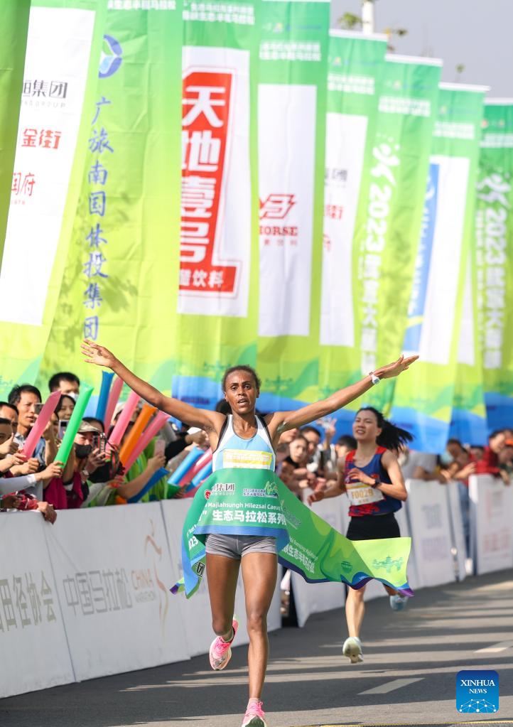 Feto Deme Abu of Ethiopia crosses the finish line during the women's race of 2023 Wuxuan Half Marathon in Wuxuan County, south China's Guangxi Zhuang Autonomous Region, April 16, 2023. (Xinhua/Hu Xingyu)