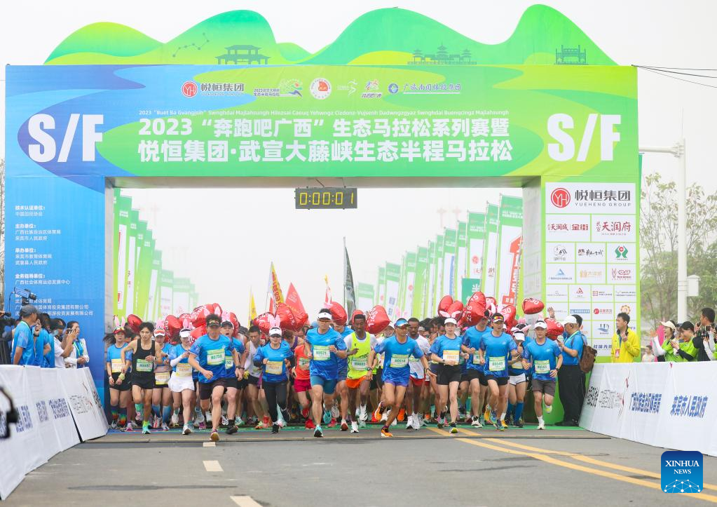 Participants start at 2023 Wuxuan Half Marathon in Wuxuan County, south China's Guangxi Zhuang Autonomous Region, April 16, 2023. (Xinhua/Hu Xingyu)