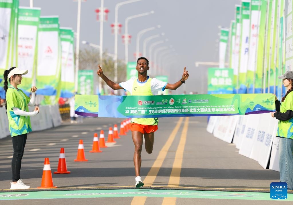 Gutema Abebe Fufa of Ethiopia crosses the finish line during the men's race of 2023 Wuxuan Half Marathon in Wuxuan County, south China's Guangxi Zhuang Autonomous Region, April 16, 2023. (Xinhua/Hu Xingyu)