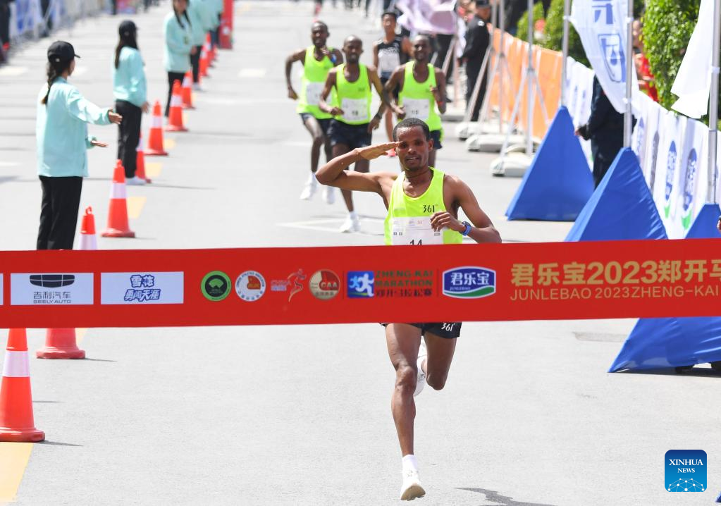 Tafere Adisu Tesfahun of Ethiopia salutes as he crosses the finish line during the men's competition of 2023 Zheng-Kai Marathon in Zhengzhou, capital of central China's Henan Province, April 16, 2023. (Xinhua/Hao Yuan)
