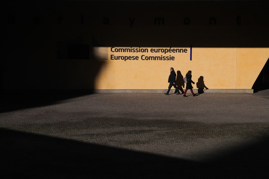 People walk past the European Commission building in Brussels, Belgium, on Dec. 21, 2021. (Xinhua/Zheng Huansong)