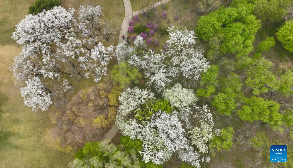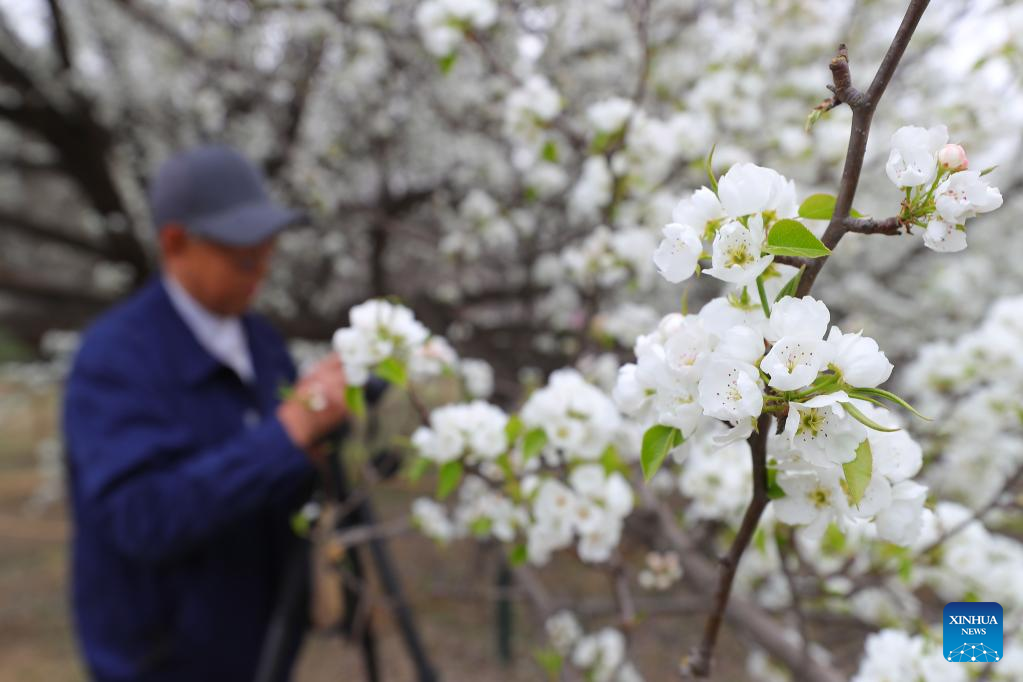 A visitor takes pictures of pear flowers in Shenyang Expo Garden in Shenyang, northeast China's Liaoning Province, April 17, 2023. (Xinhua/Yang Qing)