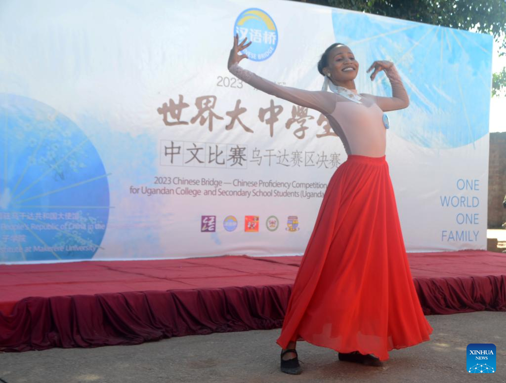 A contestant dances during the Ugandan finals of the "Chinese Bridge" competitions at Kawempe Muslim Secondary School in Kampala, Uganda, April 16, 2023. (Photo by Nicholas Kajoba/Xinhua)