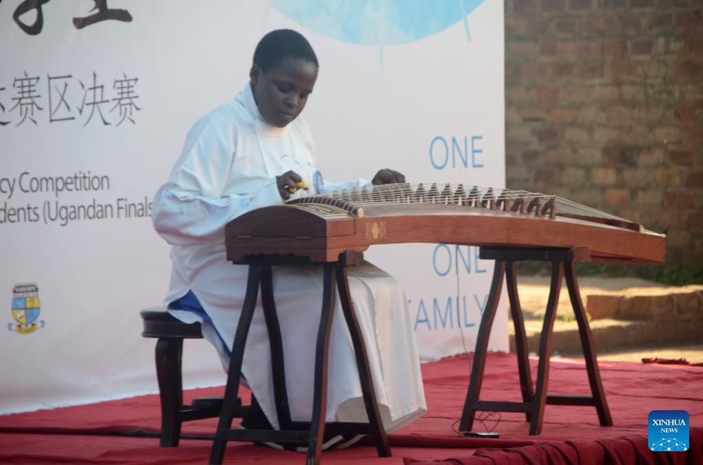 A contestant performs guzheng, a Chinese zither, during the Ugandan finals of the "Chinese Bridge" competitions at Kawempe Muslim Secondary School, Kampala, Uganda, April 16, 2023. (Photo by Nicholas Kajoba/Xinhua)