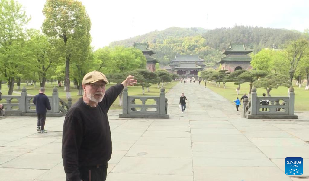 Marc Verlant narrates the history of Yuxu Palace, an ancient building in Wudang Mountains, central China's Hubei Province, April 5, 2023. Located at the foot of the Wudang Mountains in central China's Hubei Province is the home of 64-year-old Marc Verlant, which boasts a stunning collection of Chinese artifacts. (Xinhua/Xu Penghang)