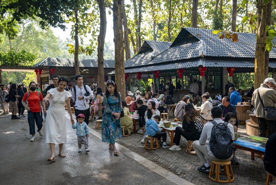 Tourists are pictured at the Xishuangbanna Tropical Botanical Garden of the Chinese Academy of Sciences in Mengla County, Xishuangbanna Dai Autonomous Prefecture, southwest China's Yunnan Province, Feb. 12, 2023. (Xinhua/Chen Xinbo)