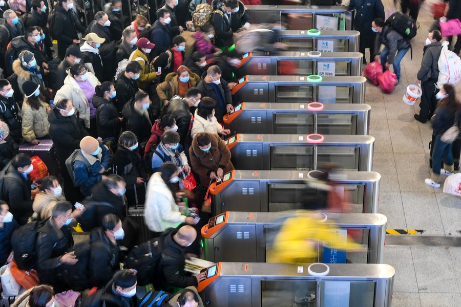 Passengers line up to enter Suzhou Railway Station in Suzhou, east China's Jiangsu Province, Jan. 7, 2023. (Xinhua/Li Bo)