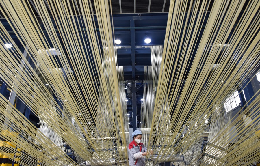 A staff member arranges raw filaments at a production base of Zhongfu Shenying Carbon Fiber Co., Ltd. in Xining, northwest China's Qinghai Province, Feb. 22, 2023. (Xinhua/Wu Gang)