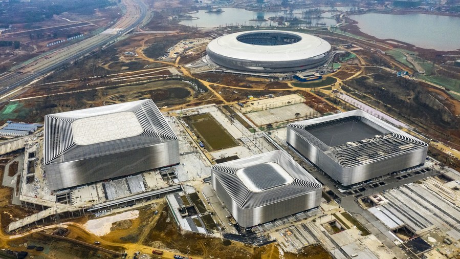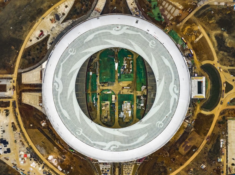 Dong'an Lake Sports Park Stadium is under construction, on Jan. 27, 2021. (Xinhua/Shen Bohan)