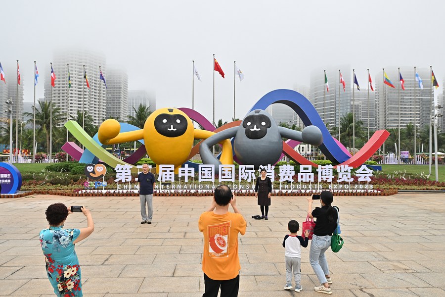 Visitors pose for photos outside the venue for the third China International Consumer Products Expo (CICPE) in Haikou, capital city of south China's Hainan Province, on April 15, 2023. (Xinhua/Li Xin)