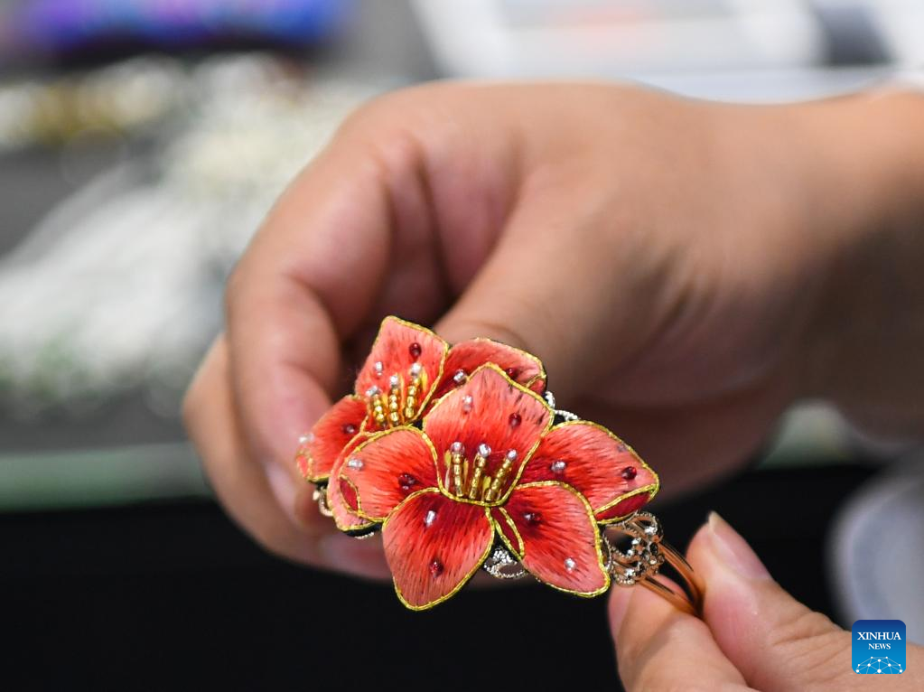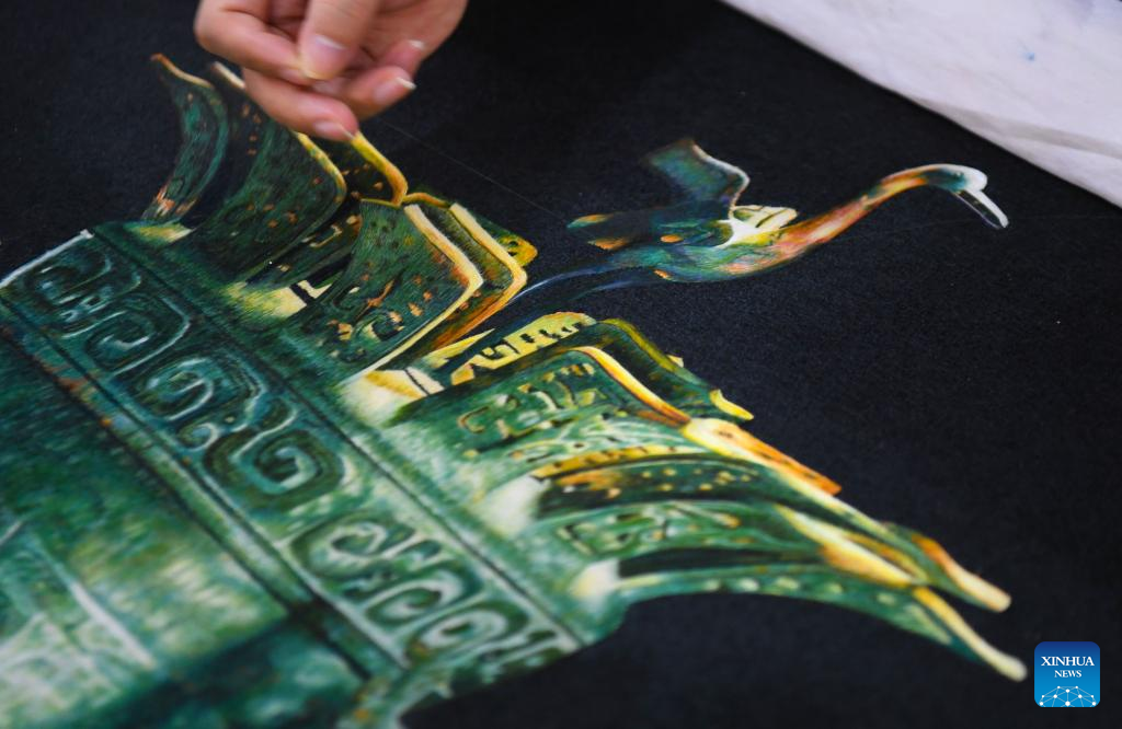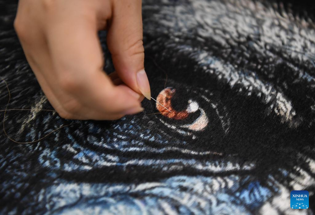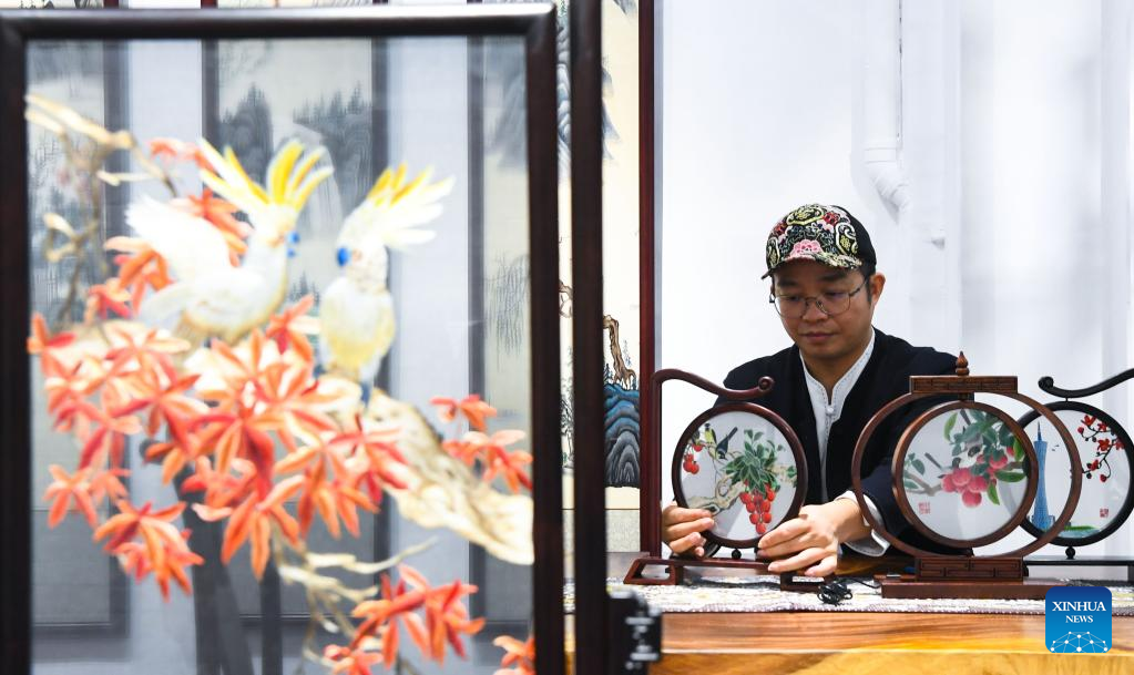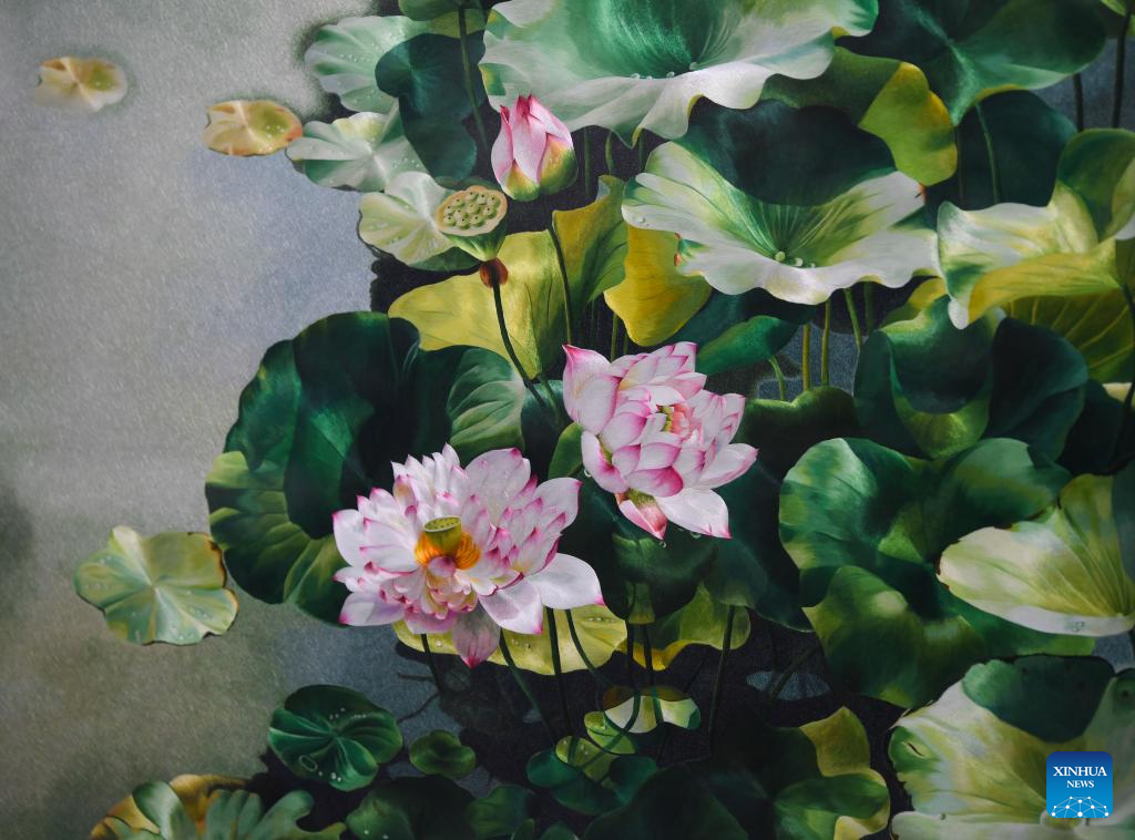 This photo taken on April 4, 2023 shows a piece of Guangzhou embroidery artwork by Wang Xinyuan in Guangzhou, south China's Guangdong Province. (Xinhua/Deng Hua)