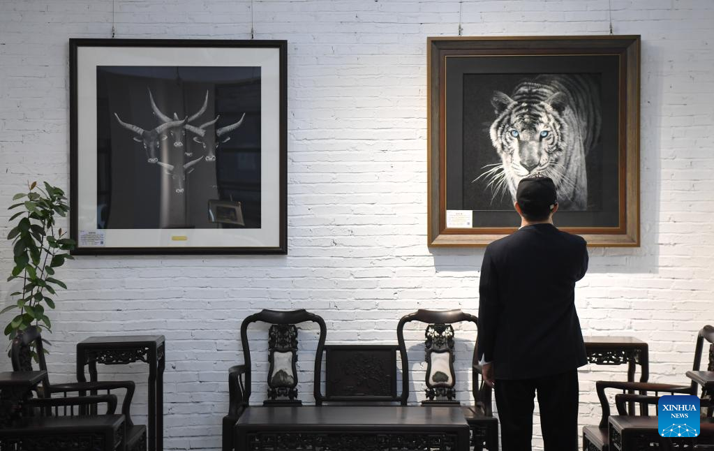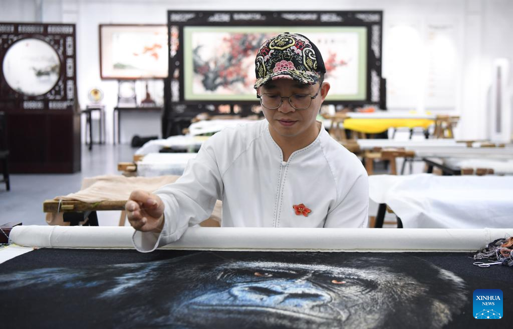 Wang Xinyuan makes a piece of Guangzhou embroidery artwork on gorilla at his studio in Liwan District of Guangzhou, south China's Guangdong Province, April 4, 2023. (Xinhua/Deng Hua)