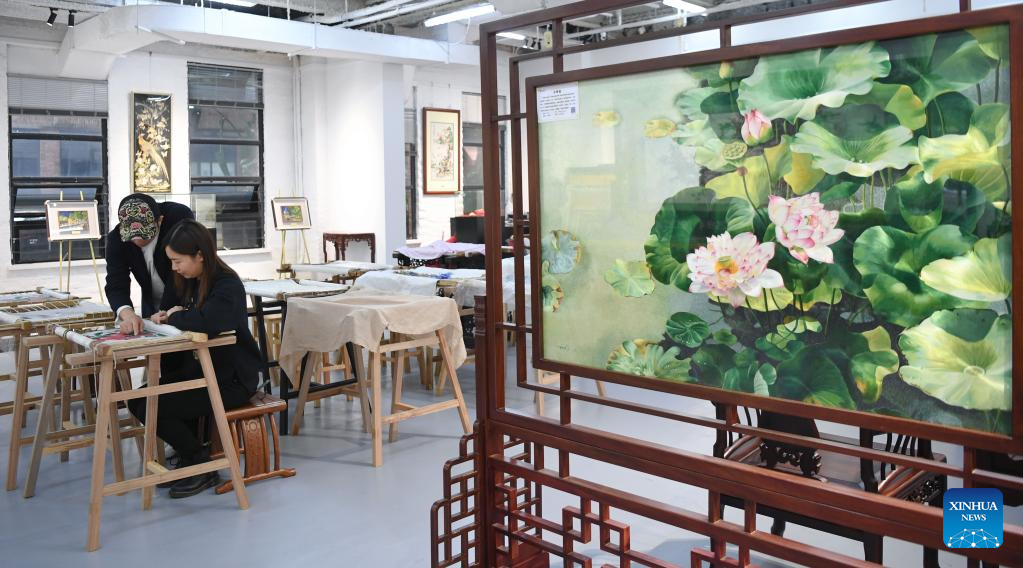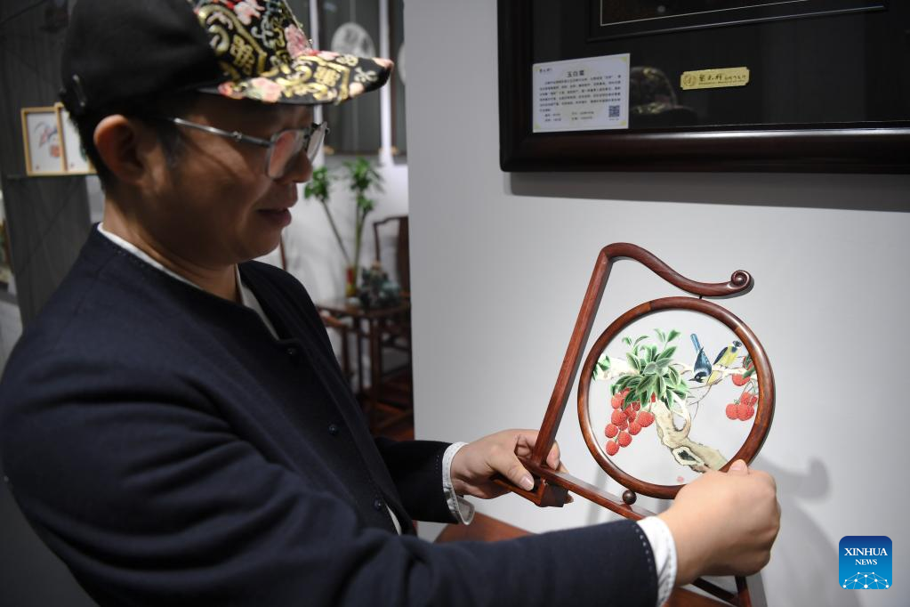 Wang Xinyuan introduces a piece of Guangzhou embroidery artwork on silk cotton flowers at his studio in Liwan District of Guangzhou, south China's Guangdong Province, April 4, 2023. (Xinhua/Deng Hua)