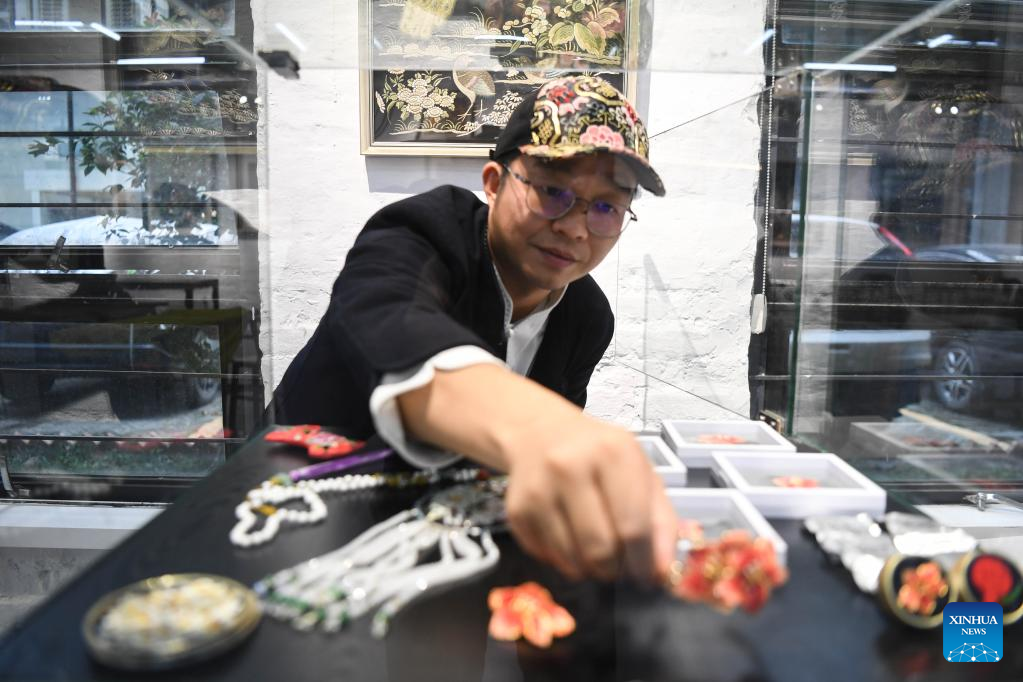 Wang Xinyuan arranges creative cultural products of Guangzhou embroidery at his studio in Liwan District of Guangzhou, south China's Guangdong Province, Dec. 6, 2022. (Xinhua/Deng Hua)