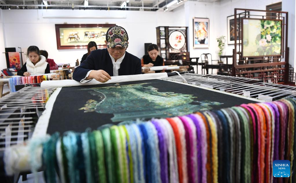 Wang Xinyuan arranges Guangzhou embroidery artworks at his studio in Liwan District of Guangzhou, south China's Guangdong Province, Dec. 6, 2022. (Xinhua/Deng Hua)