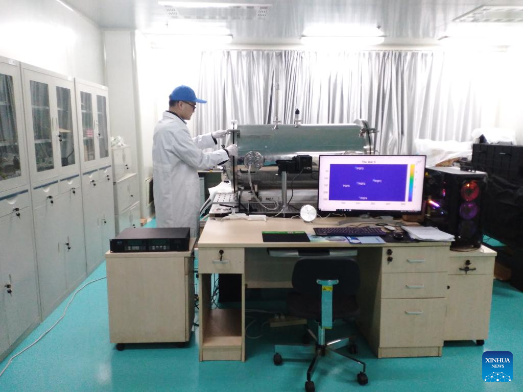 This photo taken on April 13, 2023 shows a researcher adjusting a vacuum test device for micro-pixel-level star distance measurement technology in Beijing, capital of China. (Purple Mountain Observatory, Chinese Academy of Sciences/Handout via Xinhua)
