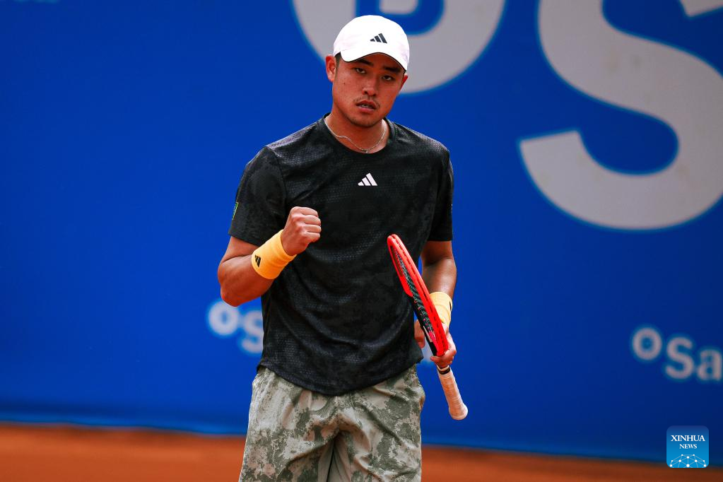Wu Yibing of China celebrates during the men's singles round of 64 match against Diego Schwartzman of Argentina at the ATP 500 Barcelona Open tennis tournament in Barcelona, Spain, April 18, 2023. (Photo by Joan Gosa/Xinhua)