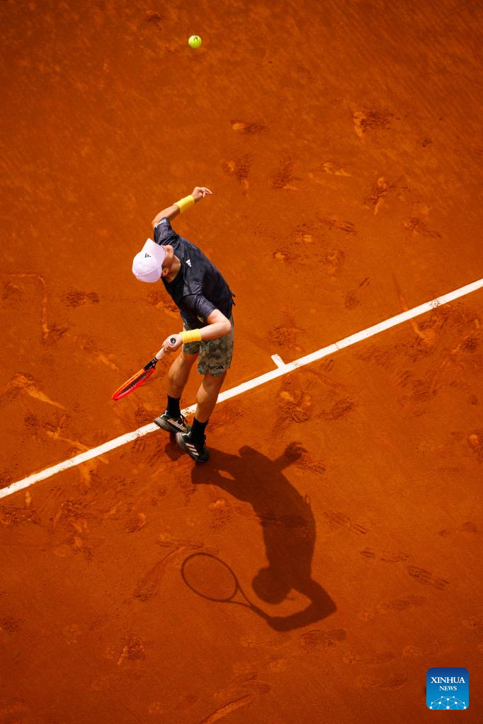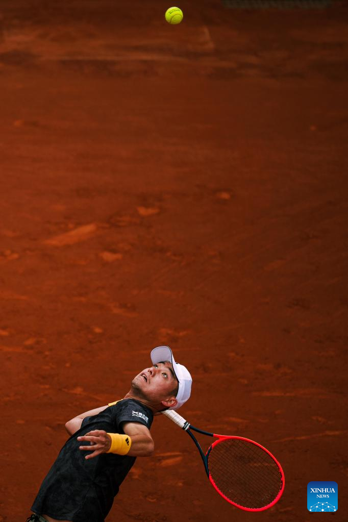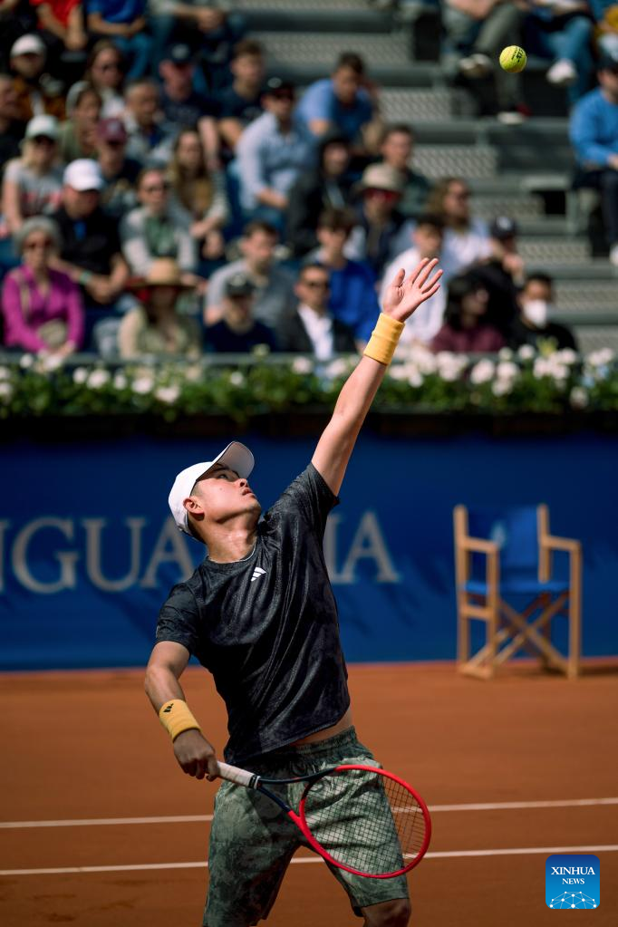 Wu Yibing of China serves during the men's singles round of 64 match against Diego Schwartzman of Argentina at the ATP 500 Barcelona Open tennis tournament in Barcelona, Spain, April 18, 2023. (Photo by Joan Gosa/Xinhua)