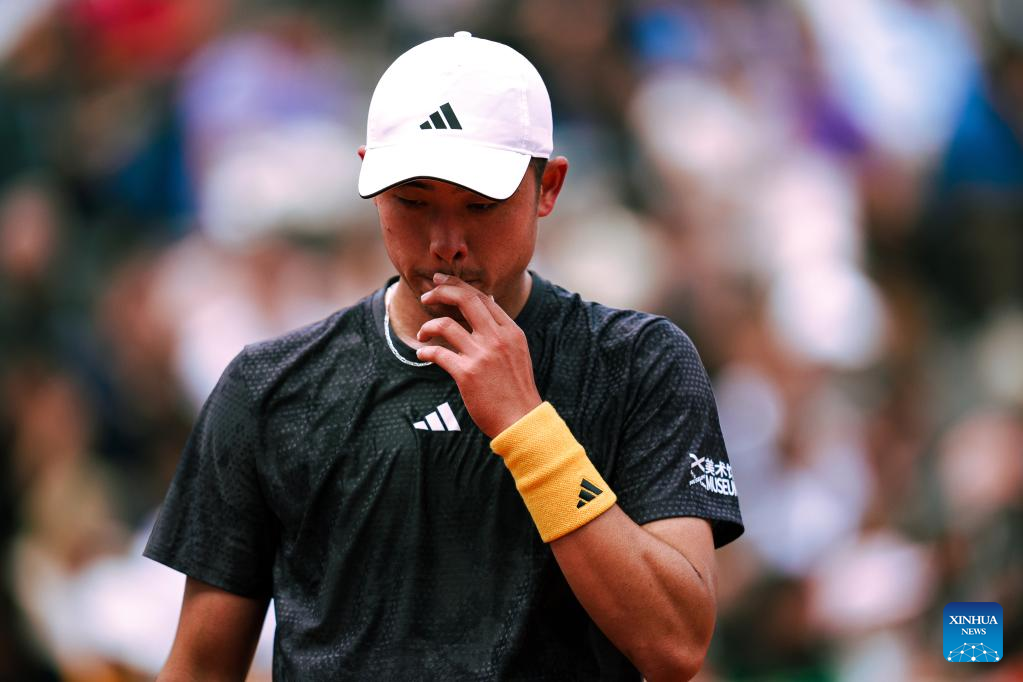 Wu Yibing of China reacts during the men's singles round of 64 match against Diego Schwartzman of Argentina at the ATP 500 Barcelona Open tennis tournament in Barcelona, Spain, April 18, 2023. (Photo by Joan Gosa/Xinhua)