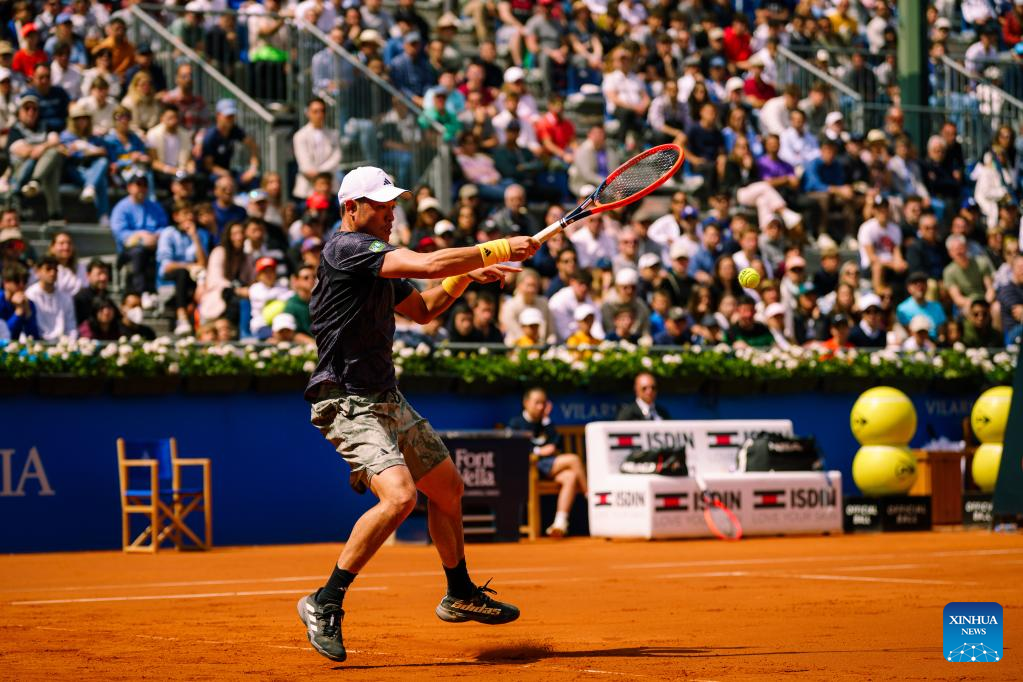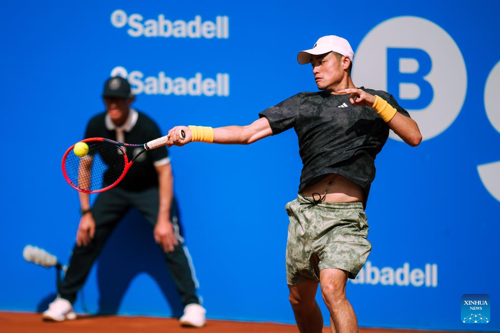 Wu Yibing of China hits a return during the men's singles round of 64 match against Diego Schwartzman of Argentina at the ATP 500 Barcelona Open tennis tournament in Barcelona, Spain, April 18, 2023. (Photo by Joan Gosa/Xinhua)